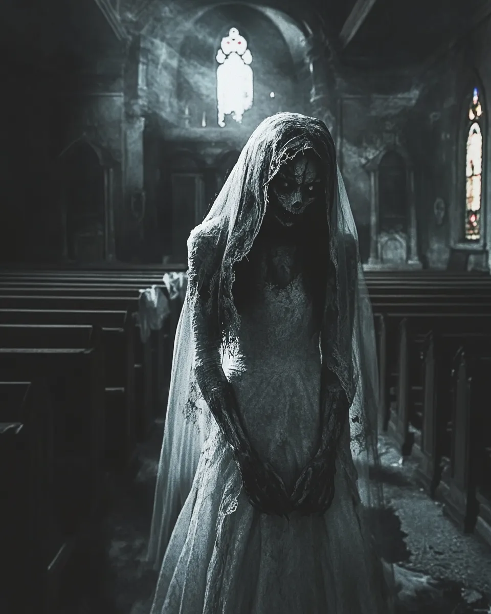 Zombie Bride in Decaying Chapel - Atmospheric Horror Art for Dark Creative Projects and Spooky Visuals