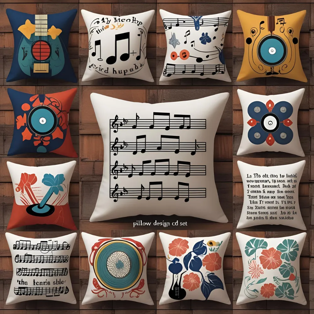 42 Music-Inspired Themes - Pillow Design CDR Set - Creative Vector Pillow Designs for Home Decor and Music Lovers